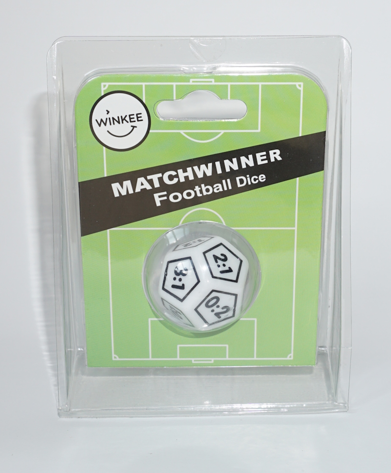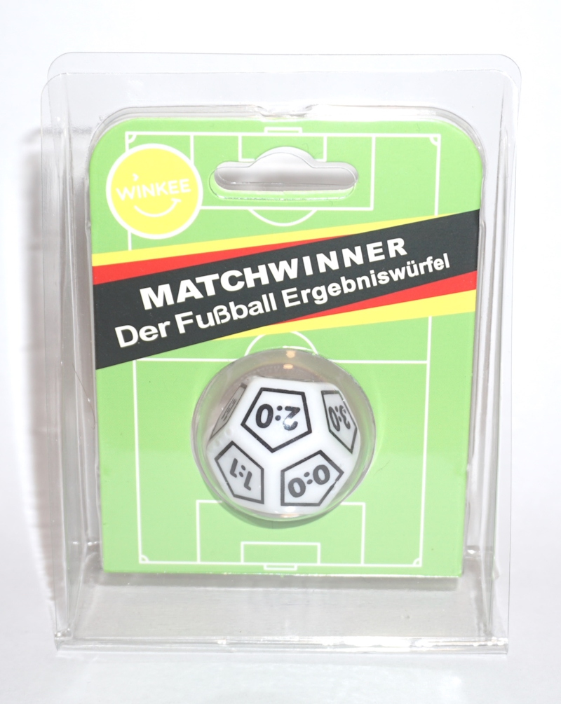 Auf dem Würfel sind Fußball-Ergebnisse entsprechend realer Häufigkeit unterschiedlich oft angebracht.