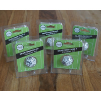 Fünf zwölfseitige Würfel (W12) mit Fußballergebnissen.