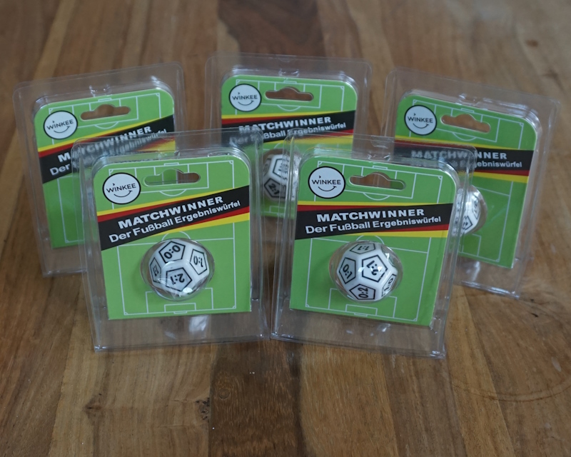 Auf dem Würfel sind Fußball-Ergebnisse entsprechend realer Häufigkeit unterschiedlich oft angebracht.