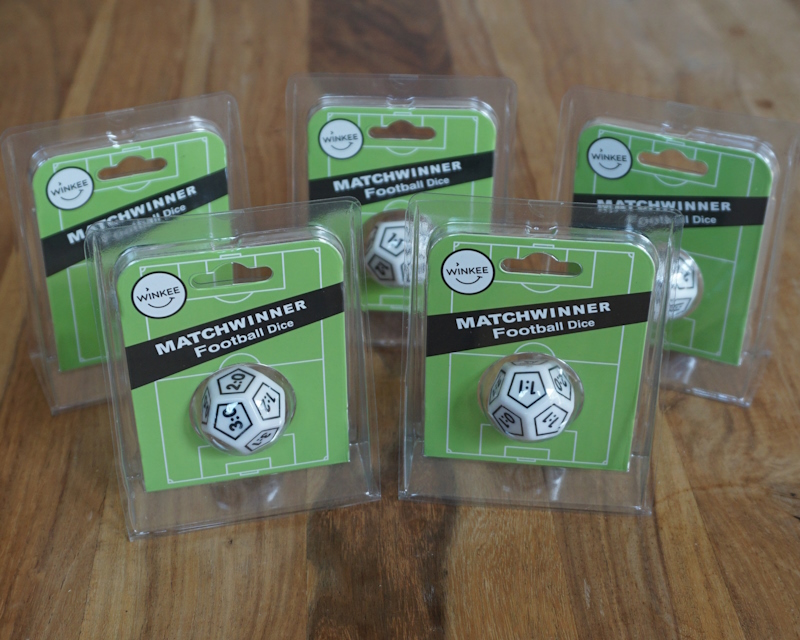 Fünf zwölfseitige Würfel (W12) mit Fußballergebnissen.