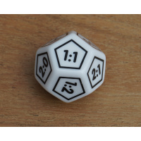 Der Würfel hat 12 Seiten, einen weißen Würfelkörper und schwarze Schrift.